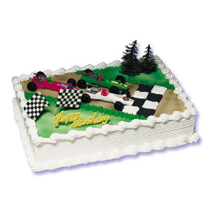 The Racer Cake Decorating Kit includes: 1 medium Tree 1 large Tree 3 Grand Prix racers 2 racing flags 1 Happy Birthday script