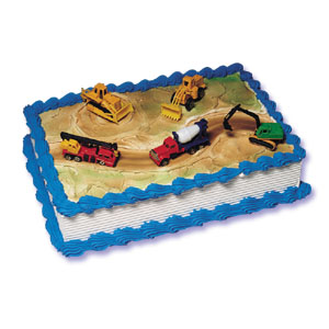 The Construction Cake Decorating Kit includes: 5 Diecast Construction Vehicles
