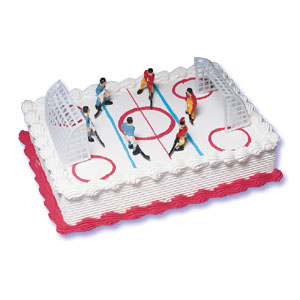 The Ice Hockey Cake Decorating Kit includes: 6 hockey player figurines (no visible skates, could be used as field hockey players) 2 goals