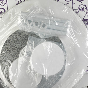 2 Tier Round Stacked assembly kit w/Delivery System Layer Sizes: 2-6" , 2- 10" Round Layers Includes Cakestand plus6" Cardboard & 12" Round Silver Drum