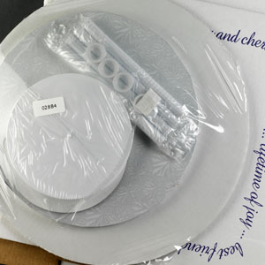 2 Tier Round Stacked assembly kit w/Delivery System Layer Sizes: 2 - 8", 2 - 12" Round Layers Includes Cakestand plus8" Cardboard Circle & 14" Round White Drum