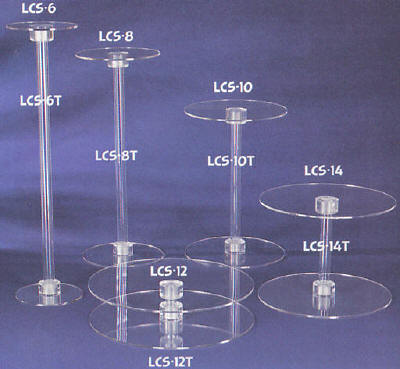 Easy to assemble cake stand components that make up this system are sold separately. Two round plates and one column are required to hold each cake section. Acrylic stand tubes are available in five heights. The round plates come in five diameters. This plate is also used on our Clear Cascade cake stands.