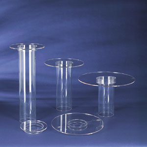 The Tube cake stand allows for versatility in design and cake size. Three 4" diameter tubes 6", 12" and 18" tall can accommodate five plates ranging in size from 6" to 14" diameter. All plates feature a 4" diameter ring which allow the plates to fit any tube. This tube system is ideal for either clear or floral accented elevations. Easy to assemble components that make up this cake stand are sold separately.