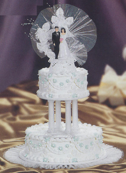 Cake Tops & Figurines Shown with cake top 171 Cakes needed: Cake configuration yields 64 servings, 48 servings without the top tier. 1 x 6 inch cake 1 x 10 inch cake Information on Cake cutting guide for servings & Cake fillings and flavors? Cake decorating tips used: Tip sdt-87 for Scallops Tip sdt-21 for Drop flower above scallops, base of fleur-de-lis, e motion top borders & bottom shell borders Tip sdt-3 for Flower centers Tip sdt-67 for Leaves Tip sdt-18 for Fleur-de-lis Colors used: frosting - White for entire cake surface, fleur-de-lis, leaves & flower centers and to fill columns sq-5336 - Light Teal for drop flowers |