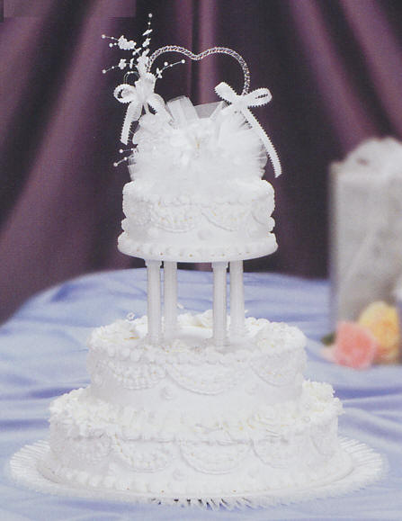 Cake Tops & Figurines Shown with cake top 1516 Cakes needed: Cake configuration yields 217 servings, 188 servings without the top tier. 1 x 8 inch cake 1 x 12 inch cake 1 x 16 inch cake Information on Cake cutting guide for servings & Cake fillings and flavors? Cake decorating tips used: Tip sdt-21 for Top and bottom reverse shell border Tip sdt-87 for Ruffle bottom around scallop Tip sdt-14 for Small shell above ruffle and rosette in between scallops Tip sdt-3 for Dots above small shell - 7 Tip sdt-67 for Leaves Tip sdt-104 for Roses and buds Colors used: frosting - White for entire cake surface and to fill clear columns |