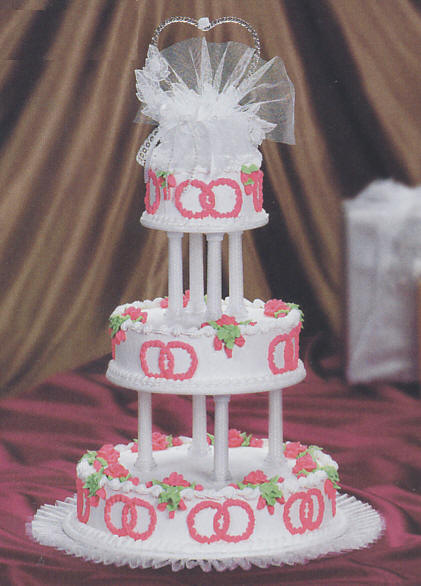 Cake Tops & Figurines Shown with cake top 1520 Cakes needed: Cake configuration yields 154 servings, 138 servings without the top tier. 1 x 6 inch cake 1 x 10 inch cake 1 x 14 inch cake Information on Cake cutting guide for servings & Cake fillings and flavors? Cake decorating tips used: Tip sdt-14 for e motion design inside double rings Tip sdt-21 for Top border reverse shell, bottom border e motion rope Tip sdt-67 for Leaves Tip sdt-104 for Roses, buds and bottom border ruffle Colors used: ip-5202 - Pink for rings, roses and rosebuds ip-5201 - Green for leaves frosting - White for entire cake surface and to fill clear columns |
