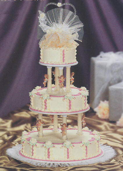 Cake Tops & Figurines Shown with cake top 1520 Cakes needed: Cake configuration yields 154 servings, 138 servings without the top tier. 1 x 6 inch cake 1 x 10 inch cake 1 x 14 inch cake Information on Cake cutting guide for servings & Cake fillings and flavors? Cake decorating tips used: Tip sdt-3 for e motion swirl on rosebuds Tip sdt-18 for Shell trim sides of cake Tip sdt-21 for Bottom shell border Tip sdt-67 for Leaves Tip sdt-104 for Roses, buds, bottom border ruffle, scallop on top border of 10 inch and 14 inch layers Colors used: ip-5228 - Ivory for entire cake surface, roses, rosebuds, shell trim, top and bottom borders and to fill clear columns ip-5212 - Mauve for icing trim, ruffle on 6 inch, 10 inch and 14 inch layers ip-5201 - Light Green for leaves |