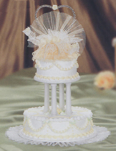 Cake Tops & Figurines Shown with cake top 1520 Cakes needed: Cake configuration yields 64 servings, 48 servings without the top tier. 1 x 6 inch cake 1 x 10 inch cake Information on Cake cutting guide for servings & Cake fillings and flavors? Cake decorating tips used: Tip sdt-3 for Dots down sides of cakes and in between shells on top border of 6 inch and 10 inch cakes, e motion piping over e motion swirl on scallops, tight e motion scallop on surface of 10 inch layer and flower centers Tip sdt-16 for Double shell bottom borders of 6 inch and 10 inch Tip sdt-18 for e motion swirl around scallops Tip sdt-67 for Leaves Tip sdt-104 for Roses Colors used: frosting - White for entire cake surface, drop flowers, and to fill clear columns ip-5218 - Egg Yellow for cake trim and roses ip-5201 - Green for leaves |