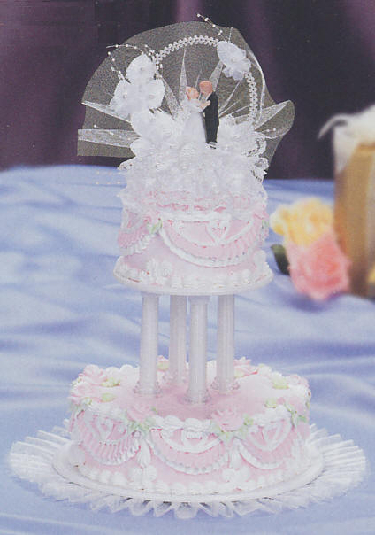 Cake Tops & Figurines Shown with cake top weddingcake1 Cakes needed: Cake configuration yields 64 servings, 48 servings without the top tier. 1 x 6 inch cake 1 x 10 inch cake Information on Cake cutting guide for servings & Cake fillings and flavors? Cake decorating tips used: Tip sdt-16 for Scroll work on scallops Tip sdt-21 for Tear drop shell in between scallops, top shell border and bottom border with 4 shells enclosed with a swirl shell Tip sdt-104 for Scallop ruffle, rose and buds Tip sdt-67 for Leaves Colors used: ip-5202 - Light Pink for entire cake surface, full roses, buds and one ruffle on scallop ip-5201 - Light Green for leaves frosting - White to fill columns |
