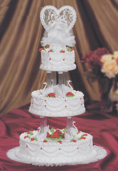 Cake Tops & Figurines Shown with cake top 940 Cakes needed: Cake configuration yields 154 servings, 138 servings without the top tier. 1 x 6 inch cake 1 x 10 inch cake 1 x 14 inch cake Information on Cake cutting guide for servings & Cake fillings and flavors? Cake decorating tips used: Tip sdt-16 for Zig zag scallops and scallops on cake surfaces Tip sdt-3 for Dots Tip sdt-21 for Shell borders Tip sdt-104 for Roses and buds Tip dct-352 for Leaves Tip dc-1446a for Decorating comb to create waves on cake layers Colors used: ip-5206 - Red for roses and dots ip-5201 - Green for leaves frosting - White for entire cake surface, scallops and borders |