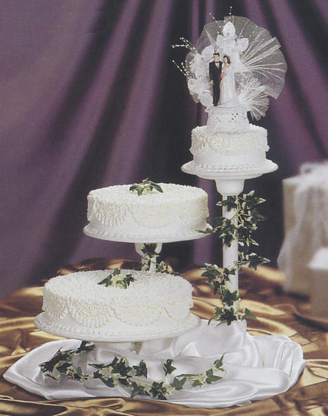 Cake Tops & Figurines Shown with cake top 171 Cakes needed: Cake configuration yields 134 servings, 118 servings without the top tier. 1 x 6 inch cake 1 x 10 inch cake 1 x 12 inch cake Information on Cake cutting guide for servings & Cake fillings and flavors? Cake decorating tips used: Tip sdt-4 for Sotas lacework all over surface of 6 inch, 10 inch and 12 inch layers Tip sdt-87 for Ruffle design on scallops Tip sdt-104 for Ruffles on bottom borders Tip sdt-7 for Bead design over bottom ruffles on bottom borders Colors used: frosting - White for entire cake surface, sotas and borders |