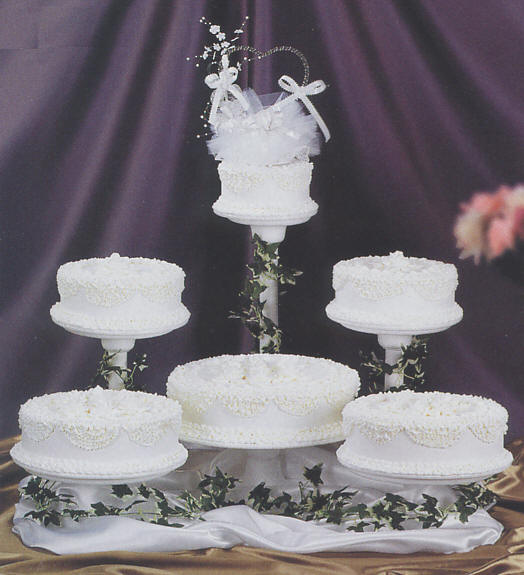 Cake Tops & Figurines Shown with cake top 1516 Cakes needed: Cake configuration yields 240 servings, 224 servings without the top tier. 1 x 6 inch cake 2 x 8 inch cakes 2 x 10 inch cakes 1 x 12 inch cake Information on Cake cutting guide for servings & Cake fillings and flavors? Cake decorating tips used: Tip rt-125 for Roses and bottom border Tip sdt-67 for Leaves Tip sdt-18 for Inside perimeter shell around roses on all cake surfaces Tip sdt-2 for Sotas design that looks like lace on scallops and bottom border Tip sdt-5 for Shell-like bead design on scallops and on bottom borders Tip dc-1a for Open coupler bottom border of all cakes Colors used: frosting - White for entire cake surface, borders, roses, leaves and sotas |