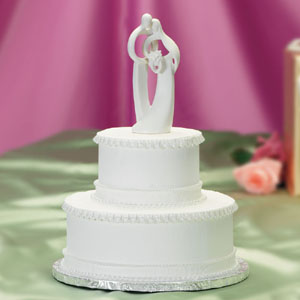 Cake Tops & Figurines Shown with cake top en-7617 Cakes needed: Cake configuration yields 64 servings, 48 servings without the top tier. 1 x 6 inch cake 1 x 10 inch cake Information on Cake cutting guide for servings & Cake fillings and flavors? Cake decorating tips used: Tip sdt-48 for top edge of cakes Tip sdt-28 for bottom edge of cakes Colors used: fon-5pw - White rolled fondant (sugarpaste) for entire cake surface frosting - White icing for decorations |