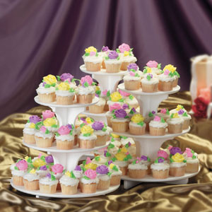 Substitutions or optional items shown: Large Icing Roses - Yellow Large Icing Roses - Pink Large Icing Roses - Blue Cakes needed: Cake configuration yields 144 servings, n/a servings without the top tier. 3 x 48 standard size cupcakes Information on Cake cutting guide for servings & Cake fillings and flavors? Cake decorating tips used: Tip sdt-8 for Icing swirls on cupcakes Tip rt-124 for Full roses and rose buds Tip dct-352 for Leaves Colors used: frosting - White icing on cupcakes ip-5214 - Lavender for roses and rosebuds ip-5202 - Pink for roses and rosebuds ip-5204 - Yellow for roses and rosebuds ip-5201 - Green for leaves |