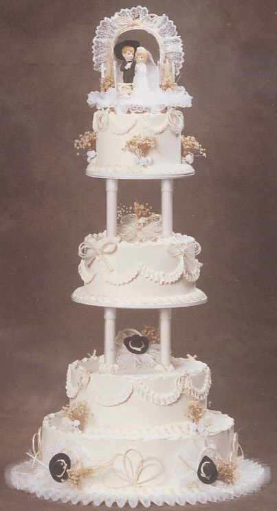 Cake Tops & Figurines Shown with cake top weddingcake1 Cakes needed: Cake configuration yields 113 servings, 103 servings without the top tier. 1 x 6 inch cake 1 x 8 inch cake 1 x 10 inch cake 1 x 14 inch cake Information on Cake cutting guide for servings & Cake fillings and flavors? Cake decorating tips used: Tip sdt-16 for Shell borders and shell drape Tip sdt-22 for S rope border and around the bottoms of columns Tip sdt-88 for Ruffled drape Colors used: ip-5228 - Ivory for entire cake surface, shell border, S rope border, ruffled drape, around bottoms of the columns, shell drape and to fill clear columns |
