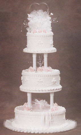 Cake Tops & Figurines Shown with cake top weddingcake1 Cakes needed: Cake configuration yields 74 servings, 64 servings without the top tier. 1 x 6 inch cake 1 x 9 inch cake 1 x 12 inch cake Information on Cake cutting guide for servings & Cake fillings and flavors? Cake decorating tips used: Tip sdt-16 for Fleur de lis, drapes over rosette border, reverse shell borders Tip sdt-2 for Dots Tip sdt-22 for Rosette borders Colors used: frosting - White for entire cake surface, fleur de lis, dots, rosette borders, drapes over rosette border and reverse shell borders |