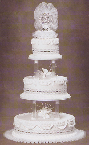 Cake Tops & Figurines Shown with cake top weddingcake1 Cakes needed: Cake configuration yields 95 servings, 85 servings without the top tier. 1 x 6 inch cake 1 x 10 inch cake 1 x 14 inch cake Information on Cake cutting guide for servings & Cake fillings and flavors? Cake decorating tips used: Tip pt-3b for Reverse shell borders Tip sdt-104 for Ruffle drapes Tip sdt-16 for C's, shell borders, around the bottom of the columns and teardrops Colors used: frosting - White for entire cake surface, reverse shell borders, ruffle drapes, shell borders and around bottoms of the columns |