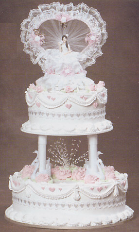 Cake Tops & Figurines Shown with cake top 143 Cakes needed: Cake configuration yields 59 servings, 41 servings without the top tier. 1 x 8 inch cake 1 x 12 inch cake Information on Cake cutting guide for servings & Cake fillings and flavors? Cake decorating tips used: Tip sdt-67 for Leaf ruffled drapes, leaves Tip sdt-16 for Tear drop shells, rosettes, drapes Tip pt-3b for Shell borders Tip sdt-2 for Tear drop hearts Tip rt-124 for Roses Tip sdt-104 for Roses Colors used: frosting - White for entire cake surface, leaf ruffled drapes, tear drop shells, rosettes, shell borders and drapes - Rose pink for Tear drop hearts, roses sq-5301 - Green for leaves |