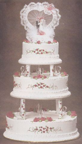 Cake Tops & Figurines Shown with cake top 341 Cakes needed: Cake configuration yields 132 servings, 114 servings without the top tier. 1 x 8 inch cake 1 x 12 inch cake 1 x 16 inch cake Information on Cake cutting guide for servings & Cake fillings and flavors? Cake decorating tips used: Tip sdt-16 for Reverse shell borders, zig-zag arcs, line on top of zig-zag curve, string arcs, reverse shells, rosettes Tip sdt-22 for Rosette borders Tip sdt-2 for Vines, dots Tip sdt-65 for Leaves Tip sdt-104 for Roses Colors used: frosting - White for entire cake surface, reverse shell borders, zig-zag arcs, zig-zag curves, lines on top of zig-zag curves, string arcs, reverse shells and rosette borders ip-5201 - Green for leaves and vines ip-5211 - Red for roses, rosettes and dots |