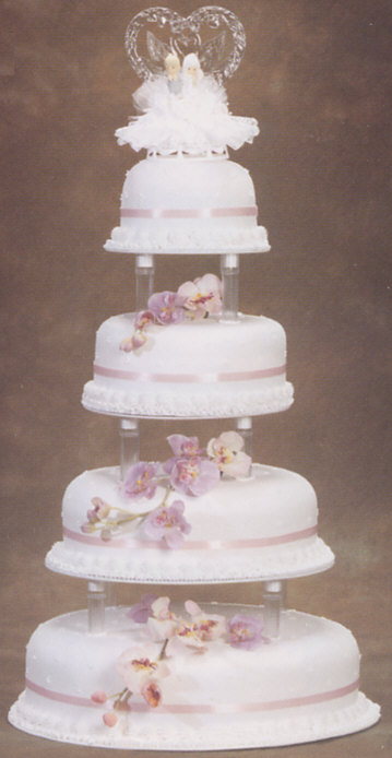 Cake Tops & Figurines Shown with cake top weddingcake1 3/8 inch Picot Ribbon - Pink Cakes needed: Cake configuration yields 147 servings, 137 servings without the top tier. 1 x 6 inch cake 1 x 9 inch cake 1 x 12 inch cake 1 x 16 inch cake x Information on Cake cutting guide for servings & Cake fillings and flavors? Cake decorating tips used: Tip sdt-67 for Ruffled borders Tip sdt-22 for Shell borders Tip sdt-2 for Dots Colors used: frosting - White for entire cake surface, ruffled borders, shell borders and dots |
