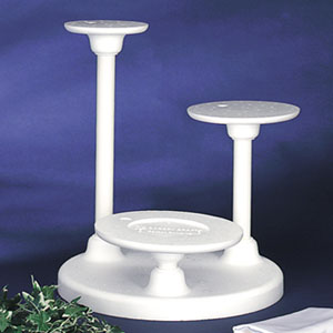 Single use 3 tier Cake Stand Made of strong cardboard polystyrene tubing and components that fit together easily. The stand consists of three tubes measuring 3 3/8", 10" and 16" and three sturdy plates. The base is 16" in diameter. All parts of the stand are completely disposable. Accessorize your stand with silk ivy and satin cloth. The silk ivy is packaged to accommodate each tube and to be used as an accent to all three cakes. Item: BC-SUS-1 Category: Cake Decorating > Cake Stands |