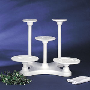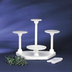 Easy Elegance 4-Tier Disposable Cake Stand Made of strong durable tubing and styrofoam plates and base. This stand is completely disposable with a total height of 17 1/2". It includes one 10" plate, two 8" plates and one 6" plate. Satin cloth and silk ivy sold separately. Item: BC-SUS-40 Category: Cake Decorating > Cake Stands |