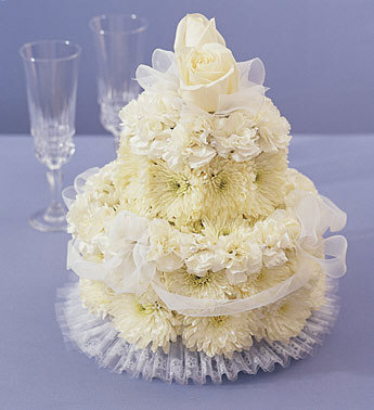 Toasting the bride and groom becomes a sensation with this scene-stealing wedding cake made of fresh, crisp flowers! Our Flower Cake is dressed in heavenly bridal garb – complete with pure white mums, white mini carnations and fairytale wedding trim topped with snow-white roses. Whether you’re the bride or the maid of honor, this cake brings a sweet slice of floral fun to engagements, bridal showers or the big day to make saying “I do” a piece of cake! Size 10” x 8”. Estimated Price: $59.99 This product is Florist delivered. |